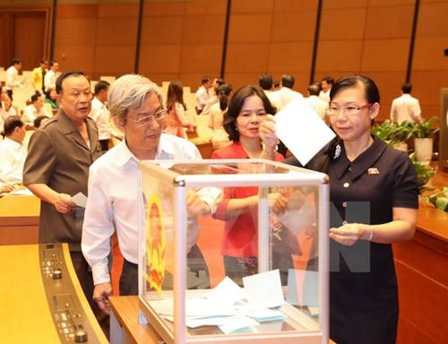国会代表投票通过免去张光义交通运输部长职务和潘文六政府总监察长职务事宜(图片来源:越通社)