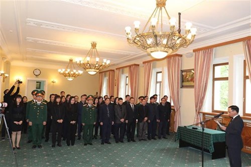 越南驻俄罗斯大使吴德孟以及大使馆全体干部人员、旅居俄罗斯越南人代表、留学生代表等参加吊唁仪式。在庄严的气氛中,各位代表已为原越共中央总书记杜梅同志默哀一分钟。