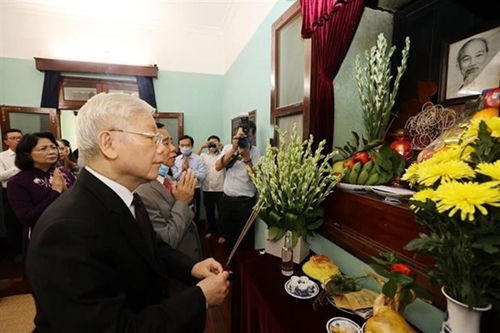 值此八月革命和九·二国庆75周年之际,9月1日上午,越共中央总书记、国家主席阮富仲前往坐落在主席府的胡志明主席遗迹区67号房进香。