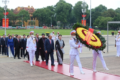 越南党、国家、祖国阵线领导同国会代表前往胡志明主席陵敬献花圈并瞻仰胡志明主席遗容(图片来源:baochinhphu.vn) |