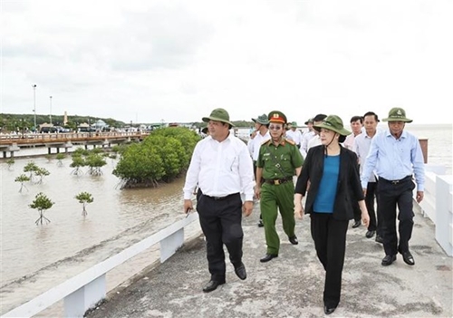 视察金瓯省玉显县金瓯角乡防浪堤坝泥滩时,阮氏金银强调,针对气候变化复杂演变趋势,泥石流灾害给防护林造成严重影响。因此,防御海岸侵蚀、河岸侵蚀被视为各级部门行业的经常性任务,同时需要各地方政府以及各组织、企业和人民的共同参与。