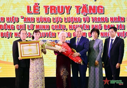 代表越南党和国家领导,阮春福主席向吕明珠同志亲人代表授予人民武装力量英雄称号证书。