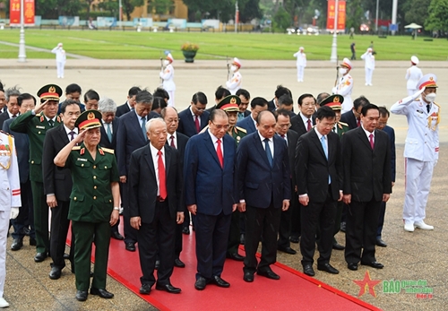 越共中央政治局委员、越南国家主席阮春福,越共中央政治局委员、书记处常务书记武文赏,越共中央委员、祖国阵线中央委员会主席杜文战,前越共中央总书记农德孟,前国会主席阮文安等党、国家领导和原领导参加活动。