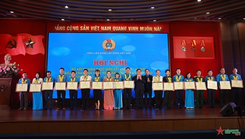 在会议上,阮仲义同志和越南劳动总联合会领导向在学习与践行胡伯伯榜样运动中取得出色成绩的58个集体和75名个人颁发奖状。