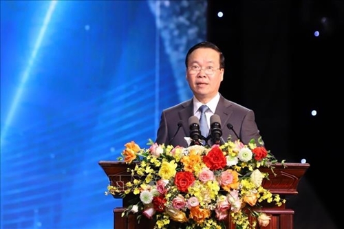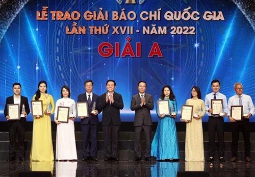 越南国家主席武文赏在颁奖典礼上发表讲话,高度评价全国新闻工作者队伍取得的巨大成就,热烈祝贺荣获2022年度新闻奖的记者们。