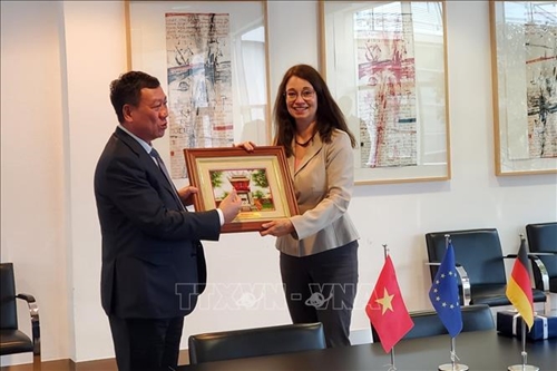 段洪峰向德国司法部国务秘书安吉莉卡·施伦克(Angelika Schlunck)赠送礼物(图片来源:越通社) |