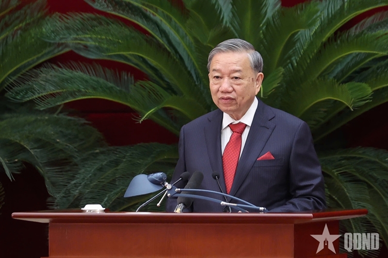 越共中央总书记苏林在会上发表讲话(图片来源:人民军队报) |