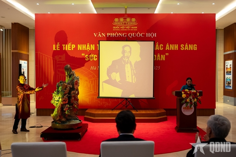 11月15日下午在国会大厦,国会主席陈青敏出席了光雕艺术作品《民心力量》接收仪式,该作品由艺术家裴文字捐赠给越南国会博物馆。