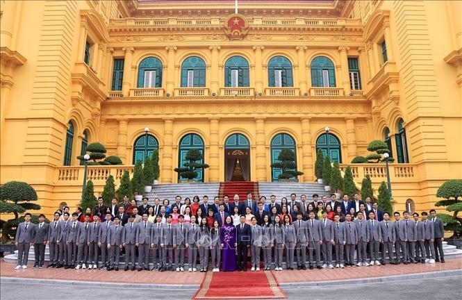 12月12日上午,越南国家副主席、中央竞赛奖励委员会第一副主席武氏映春在主席府与在2025年国际奥林匹克竞赛和国际科学技术竞赛中取得优异成绩的学生会面并向其授予劳动勋章。