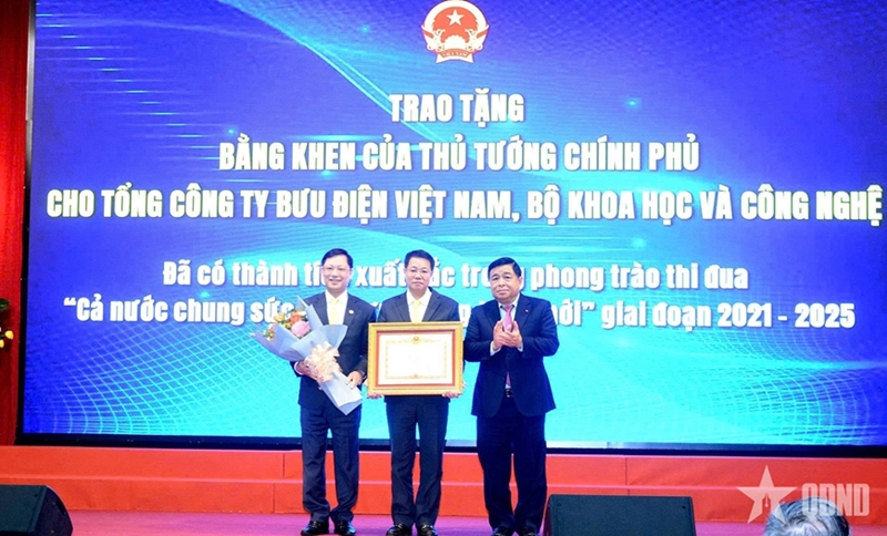 越南政府副总理阮志勇向越南邮政总公司颁发政府总理嘉奖证书(图片来源:人民军队报) |