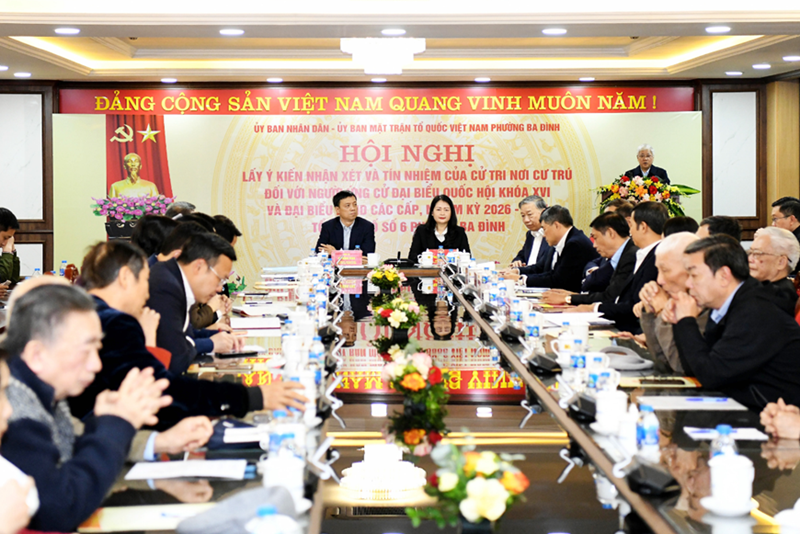 越南祖国阵线巴亭坊委员会与河内市巴亭坊人民委员会2月4日联合举行会议,征求居住地选民对第十六届国会代表候选人(2026—2031 年任期)的意见和信任度。