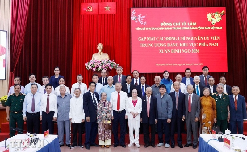 值此纪念越南共产党建党96周年和喜迎丙午年新春之际,2月9日上午,越共中央总书记苏林在胡志明市主持南部地区历届越共中央委员见面会。