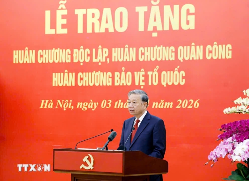 仪式上,苏林总书记向越共十三届中央政治局委员、政府总理范明政授予一级独立勋章;向越共十三届中央政治局委员、国家主席梁强大将,中央政治局委员、中央军委副书记、国防部长潘文江大将,越共十三届中央政治局委员、国会副主席陈光方上将以及党和国会的多位高级领导人授予了一级军功勋章。