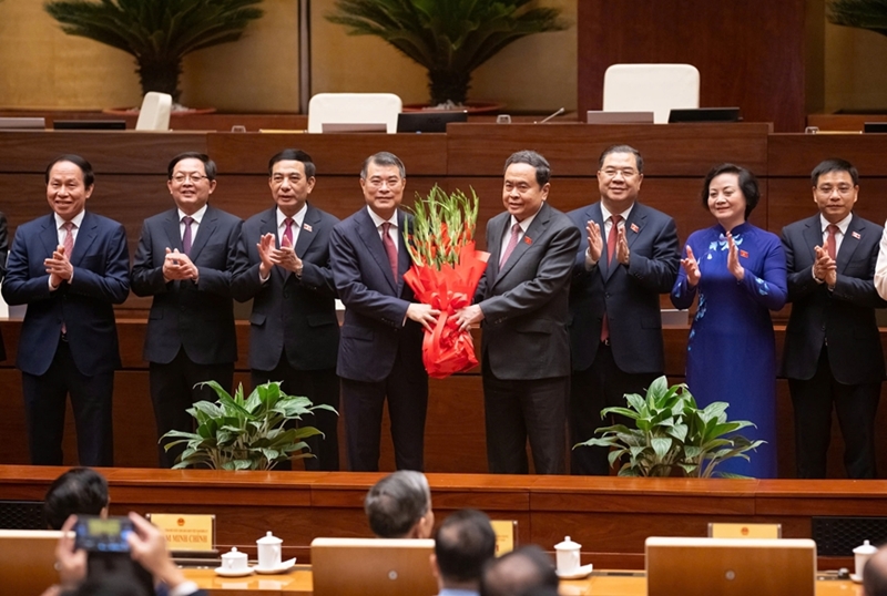 越南国会主席陈青敏向政府总理、政府副总理、部长及部级机构首长赠送鲜花表示祝贺(图片来源:人民军队报) |