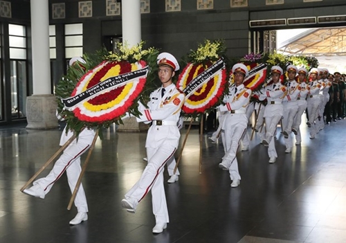 越共中央总书记、国家主席阮富仲;原越共中央总书记黎可漂、农德孟;原国家主席陈德良、张晋创;原政府总理阮晋勇等送花圈悼念。
