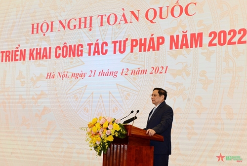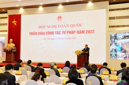 12月21日上午,越南司法部以线上形式举行2022年司法工作全国会议。越共中央政治局委员、政府总理范明政出席并发表主旨演讲。