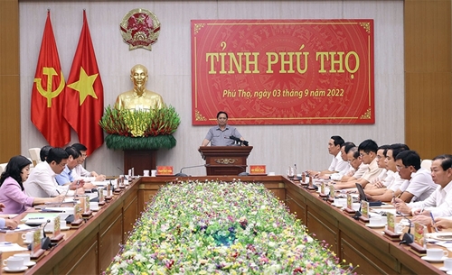 视察富寿省期间,9月3日,越共中央政治局委员、越南政府总理范明政和政府工作代表团与富寿省委常委就2021年和2022年前六个月以及今后富寿省经济发展问题举行工作会议。