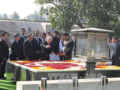 欢迎仪式结束后,阮富仲总书记一行赴甘地陵(Raj Ghat)向印度民族主义运动和国大党领袖圣雄甘地(Mahatma Gandhi)敬献花圈。在这里,越南高级代表团了解到圣雄甘地的生平与事业,并进行撒花仪式以缅怀印度这位民族英雄。