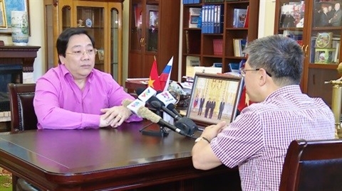 | 越南驻俄罗斯大使阮青山(左)接受采访(图片来源:越通社) |