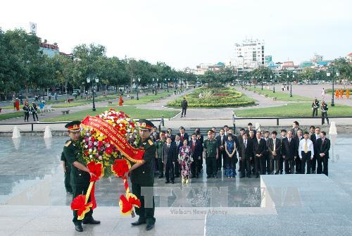| 越南驻柬埔寨大使馆干部人员、各代表机构、越侨代表和在柬越南企业已前往设在金边的越南志愿军纪念碑敬献花圈(图片来源:越通社) |