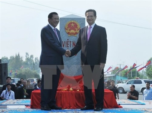 | 越南政府总理阮晋勇和柬埔寨政府首相洪森出席两国陆地边界线上275号界碑落成典礼(图片来源:越通社) |