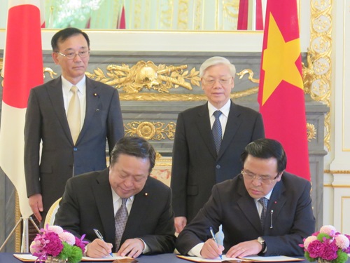 值此之际,阮富仲总书记与谷垣祯一干事长共同见证了关于加强越南共产党与日本自民党合作关系备忘录签约仪式。
