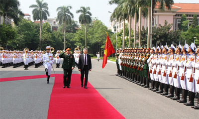 | 两位部长检阅越南人民军三军仪仗队(图片来源:人民军报) |