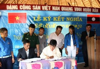 越南昆嵩省得格蕾(Dak Glei)县得龙(Dak Long)乡育郎(Duc Lang)村和老挝阿速波(Attapeu)省Xanxay县Vangtak村寨区Thongcay Ooc村寨等两地领导和人民一同参加双方建立友好村寨文件签署仪式,同时双方就相互帮助的各项主要内容达成一致;承诺共同维护越老边界线、界碑、边界标志等;确保边民严格遵守边境往来规定,不许侵犯各自领土,不许跨境开枪,不许在各自边界带进行耕地种植等。