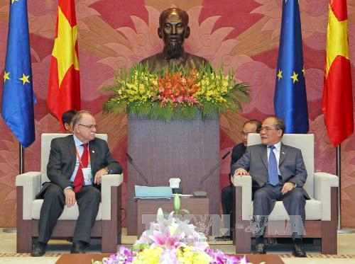 国会主席阮生雄对欧洲议会副议长迪米特里奥斯在议联第132届大会上的讲话予以高度评价,并认为,这为本届大会的成功作出贡献。 国会主席阮生雄对25年来越南与欧盟乃至欧盟各成员国之间的关系呈现蓬勃发展趋势深表高兴。他特别强调了欧洲议会在加强越南与欧盟关系中的重要角色。 他重申,越南国会愿意本着合作精神同欧洲议会交换信息,并就需要关注的问题开展建设性的对话。 欧洲议会副议长迪米特里奥斯重申,欧洲议会愿同越南国会在各个领域上开展合作并将全力以赴推动签署越南-欧盟自由贸易协定,同时希望,未来越南国会与欧洲议会将加强互访活动,为增强双方关系——越南与欧盟全面合作伙伴关系的重要支柱注入动力。