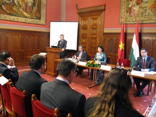 离开匈牙利之前,当地时间4月11日中午在首都布达佩斯,越南国会主席阮氏金银与匈牙利国会主席克韦尔共同主持题为“融入国际社会进程中完善法律体系”的两国国会法律问题座谈会开幕式。这是两国国会配合举办的首场法律问题座谈会。