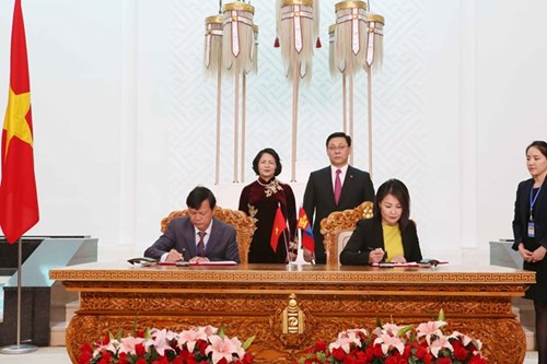 会谈结束时,两国领导出席越南劳动荣军社会部与蒙古国劳动社会保障部关于人口和社会民生领域合作备忘录的签字仪式。