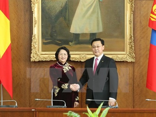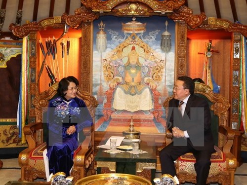 *邓氏玉盛在会见蒙古人民党主席、国家大呼拉尔(议会)主席(议长)米耶布贡·恩赫包勒德(Miyegombo Enkhbold)时强调,越南正深入推进革新及工业化、现代化事业,希望维护和平稳定局势,加强与其他国家的互利合作以及重视深化与蒙古在多领域的友好合作关系。