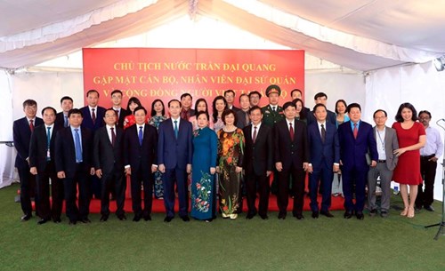 越南国家主席陈大光同越南驻印大使馆工作人员和旅印越南人社群代表合影(图片来源:越通社) |