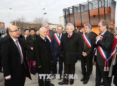 来到舒瓦西勒鲁瓦市,阮富仲参观了于2013年值巴黎协定纪念40周年之际竣工的巴黎协定广场,并会见了部分法国朋友。