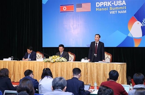 2月25日,美朝领导人第二次会晤筹备工作媒体吹风会在河内举行。越南信息传媒部长阮孟雄、外交部副部长黎怀忠、河内市人民委员会主席阮德钟共同主持吹风会。