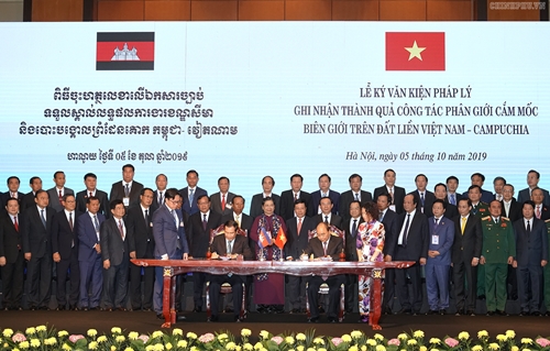 越南政府总理阮春福与柬埔寨首相洪森于10月5日在河内共同主持召开越南与柬埔寨2002-2019年阶段陆地边界勘界立碑工作总结会议。