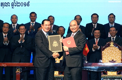 阮春福和洪森一致认为,上述两份重要文件的签署将促进边界勘界立碑工作的完成,进而推进两国人民,尤其是边境地区人民贸易往来和民间交流。