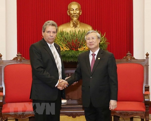 越共中央政治局委员、书记处常务书记陈国旺(右)会见古巴共产党中央书记处书记、中央思想部部长维克托·高特·洛佩兹(图片来源:越通社) |