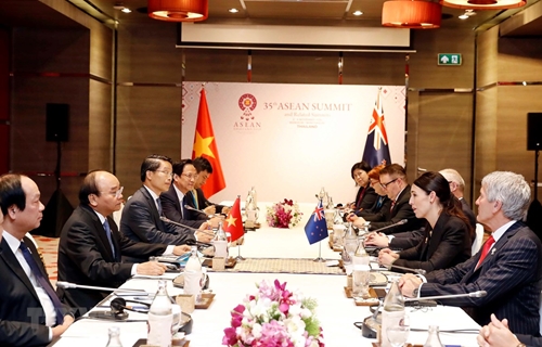 10月4日上午,在泰国首都曼谷出席第35届东盟峰会期间,越南政府总理阮春福会见了新西兰总理杰辛达·阿德恩。