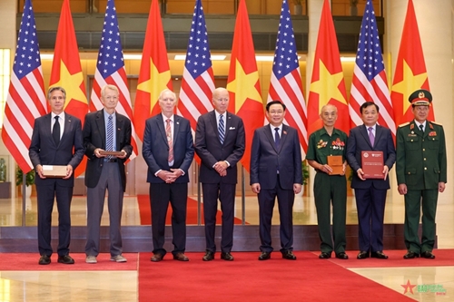 在会见中,拜登和王廷惠共同见证越南和美国国防部和老兵协会互相赠送战争遗物,这是具有象征性和深刻人文价值的义举。双方就共同努力弥合战争创伤达成一致,并就此项工作的重要性进行讨论。
