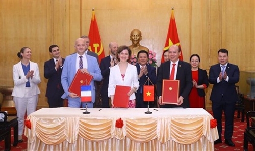 阮春胜和斯达尼斯拉斯·盖里尼已见证胡志明国家政治学院与法国国家公共服务学院(INSP)、法国行政与公共事务总局之间的三方合作备忘录的签署。