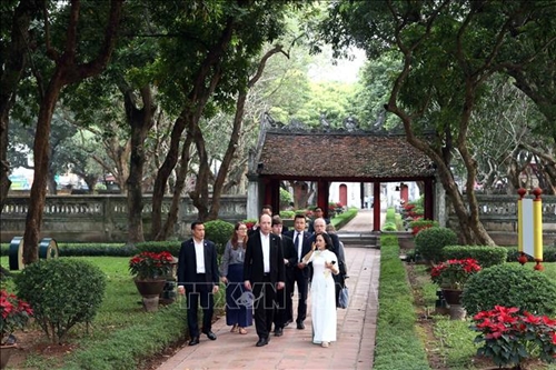 芬兰议会议长尤西·哈拉阿霍参观文庙-国子监古老建筑物,了解越南第一所大学的形成与发展历程,以及详细了解保护弘扬越南学道之地。