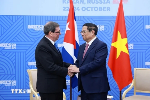 当地时间10月24日,越南政府总理范明政在俄罗斯喀山市会见了古巴外交部长布鲁诺·罗德里格斯·帕里利亚(Bruno Rodriguez Parrilla)。