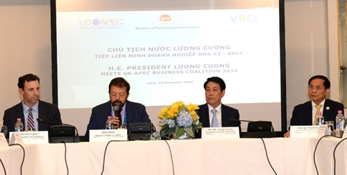 人民军队:出席在秘鲁首都利马举行的亚太经合组织峰会周之际,当地时间11月14日下午,越南国家主席梁强会见了美国-亚太经合组织(APEC)企业联盟代表团。