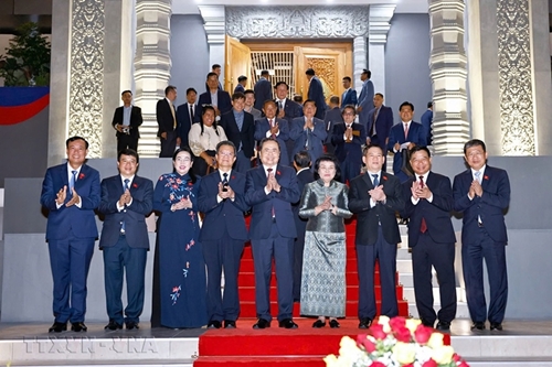 正在对柬埔寨进行正式访问的越南国会主席陈青敏与柬埔寨国会主席昆索达莉共同主持柬埔寨国会行政办公楼落成典礼。