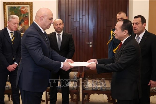 越南驻埃及兼驻黎巴嫩大使阮辉勇3月11日在黎巴嫩首都贝鲁特的巴卜达宫向黎巴嫩总统约瑟夫·奥恩(Joseph Aoun)递交越南国家主席梁强的委任书。