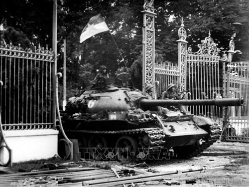 1975年4月30日中午,解放军坦克撞倒独立宫铁门,标志着越南民族抗美救国战争取得完全胜利(图片来源:越通社) |