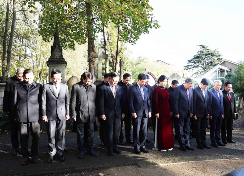 在对大不列颠及北爱尔兰联合王国进行正式访问期间,当地时间10月28日上午,越共中央总书记苏林及夫人吴芳璃率越南高级代表团前往伦敦海格特墓地瞻仰无产阶级领袖卡尔·马克思墓。