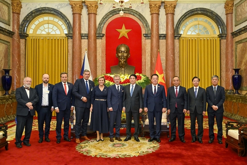 越南国家主席梁强与捷克参议院议长米洛斯·维斯特奇尔及各位代表(图片来源:人民军队报) |