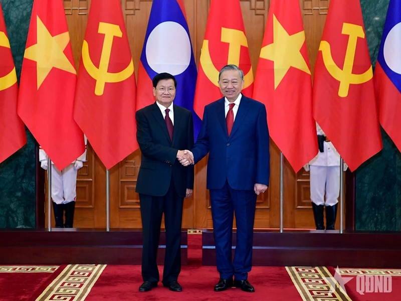 1月26日上午,欢迎老挝人民革命党中央总书记、国家主席通伦·西苏里及夫人和老挝党、国家高级代表团的正式仪式以最高国家元首礼仪在主席府隆重举行。苏林总书记及夫人主持欢迎仪式。